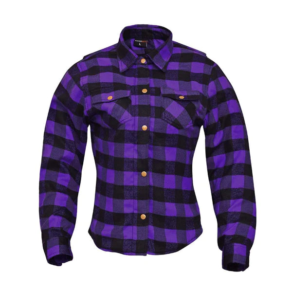 Introducing the Ladies Armored Denim Biker Shirt with Aramid® by DuPont™ Fibers. This shirt combines style and protection for motorcycle riders. Made of durable cotton flannel reinforced with Kevlar, it offers strength and abrasion resistance. The dual front closure with snap buttons and zipper ensures a secure fit. CE approved armor on the shoulders and elbows, reinforced with DuPont™ KEVLAR® Aramid Fiber, provides reliable protection. It features concealed gun and ammo pockets, electronic media pocket, and multiple storage pockets. The ventilated underarms, action back design, and mesh lining offer comfort and breathability. With genuine YKK antique color zippers and snap buttons, it exudes durability and style. The lower inside back hook with snap button prevents the garment from lifting. Milwaukee Performance Apparel is made for riders who value both style and longevity.