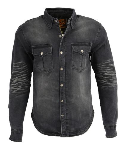 Introducing the Milwaukee Performance MPM1620 Men's Armored Denim Biker Shirt with Aramid® by DuPont™ Fibers. This shirt combines style and protection for motorcycle riders. Made of durable cotton flannel reinforced with Kevlar, it offers strength and abrasion resistance. The dual front closure with snap buttons and zipper ensures a secure fit. CE approved armor on the shoulders and elbows, reinforced with DuPont™ KEVLAR® Aramid Fiber, provides reliable protection. It features concealed gun and ammo pockets, electronic media pocket, and multiple storage pockets. The ventilated underarms, action back design, and mesh lining offer comfort and breathability. With genuine YKK antique color zippers and snap buttons, it exudes durability and style. The lower inside back hook with snap button prevents the garment from lifting. Milwaukee Performance Apparel is made for riders who value both style and longevity.