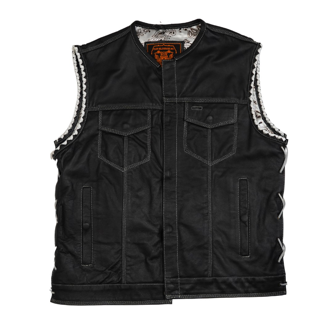 Crafted from premium heavy lamb skin, this vest exudes durability and comfort. The adjustable sides ensure a personalized fit, while the striking White Paisley liner adds a touch of flair.