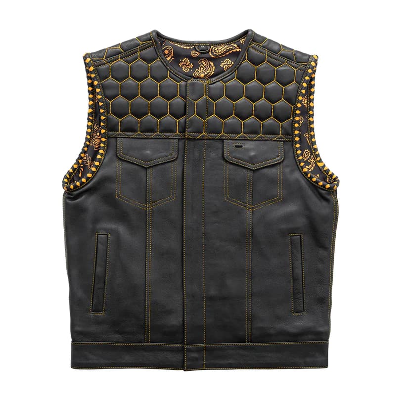 The sturdy construction and customizable back panel make it ideal for personalization. Features such as a one-inch collar, quilted texture, and braided armholes add style. Quick access conceal carry pockets, satin interior cell pocket, and easy access panels enhance functionality. Elevate your motorcycle style with this high-quality, stylish vest.