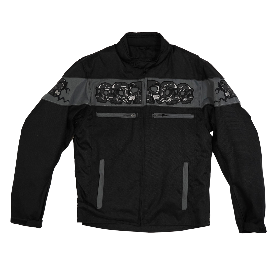 Introducing the Men's Skull Jacket GRY: A versatile textile jacket designed for riders who value both style and functionality. Crafted with precision, this jacket offers a blend of urban aesthetics and rugged performance.