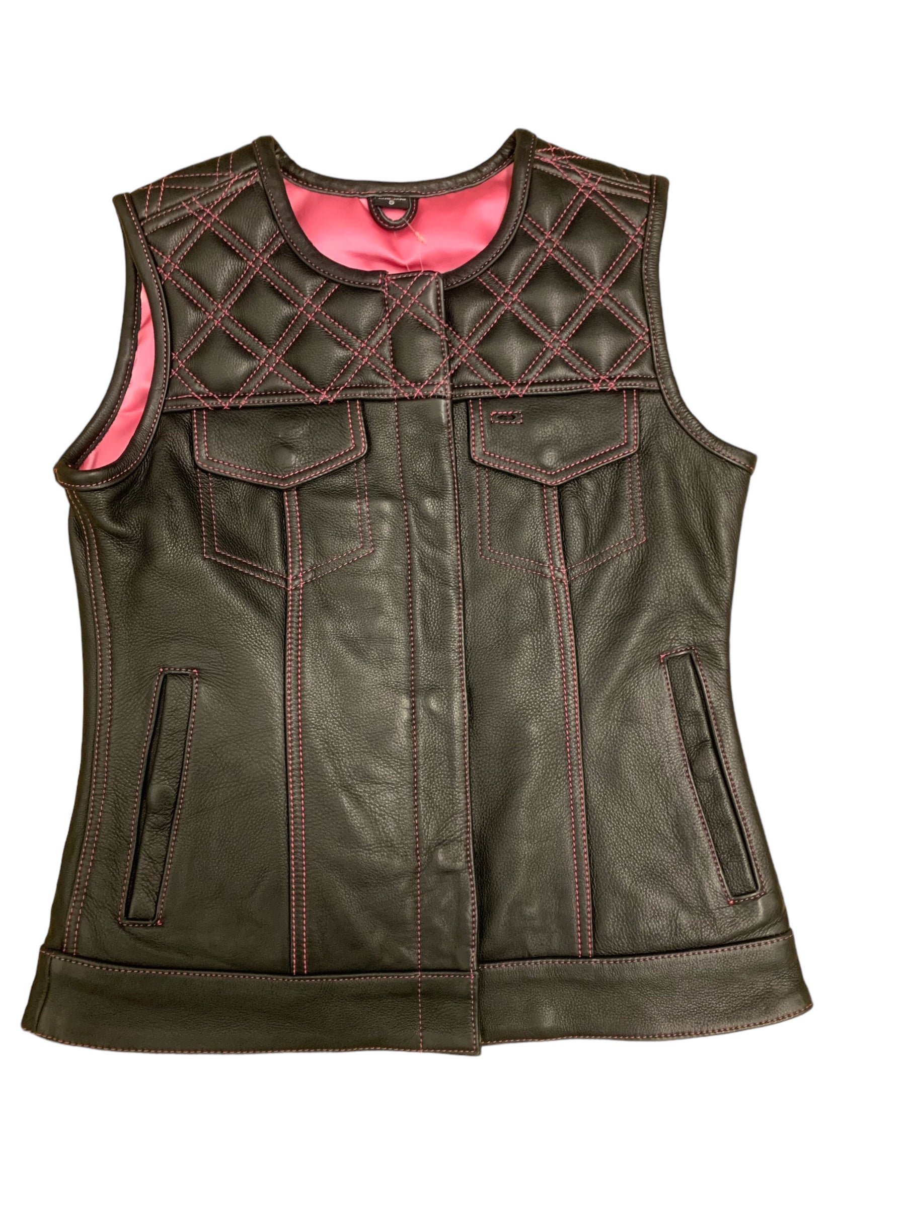 The vest features a Western-style V-neck, a classic four snap front, and a side lacing Western-style back for a personalized fit. Safety is ensured with zippered slash pockets, concealed carry pockets, and tapered holsters. The mesh lining and easy access panel allow for breathability and customization. Upgrade your gear with the Pink Biker Vest and stay prepared on the go.