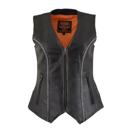Stay organized with multiple pockets, including concealed carry pockets for added convenience. The side lacing allows for a customized fit, while the mesh lining ensures breathability. Upgrade your riding experience with the Studded Ladies Vest and make a bold statement on the road.
