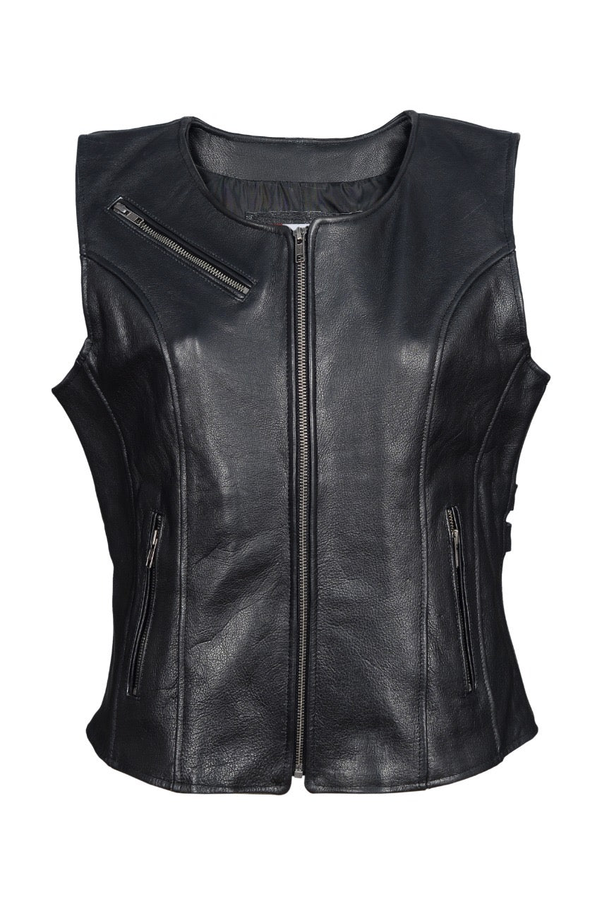 Introducing the Zipper Vest Leather Ladies, a stylish and practical choice for motorcycle enthusiasts. This vest is made from soft milled cowhide leather, ensuring durability and comfort. With its Western-style V-neck and four snap front, it exudes a classic charm. The vest features multiple pockets, including zippered slash pockets, horizontal pockets, and concealed carry pockets for added convenience and security.